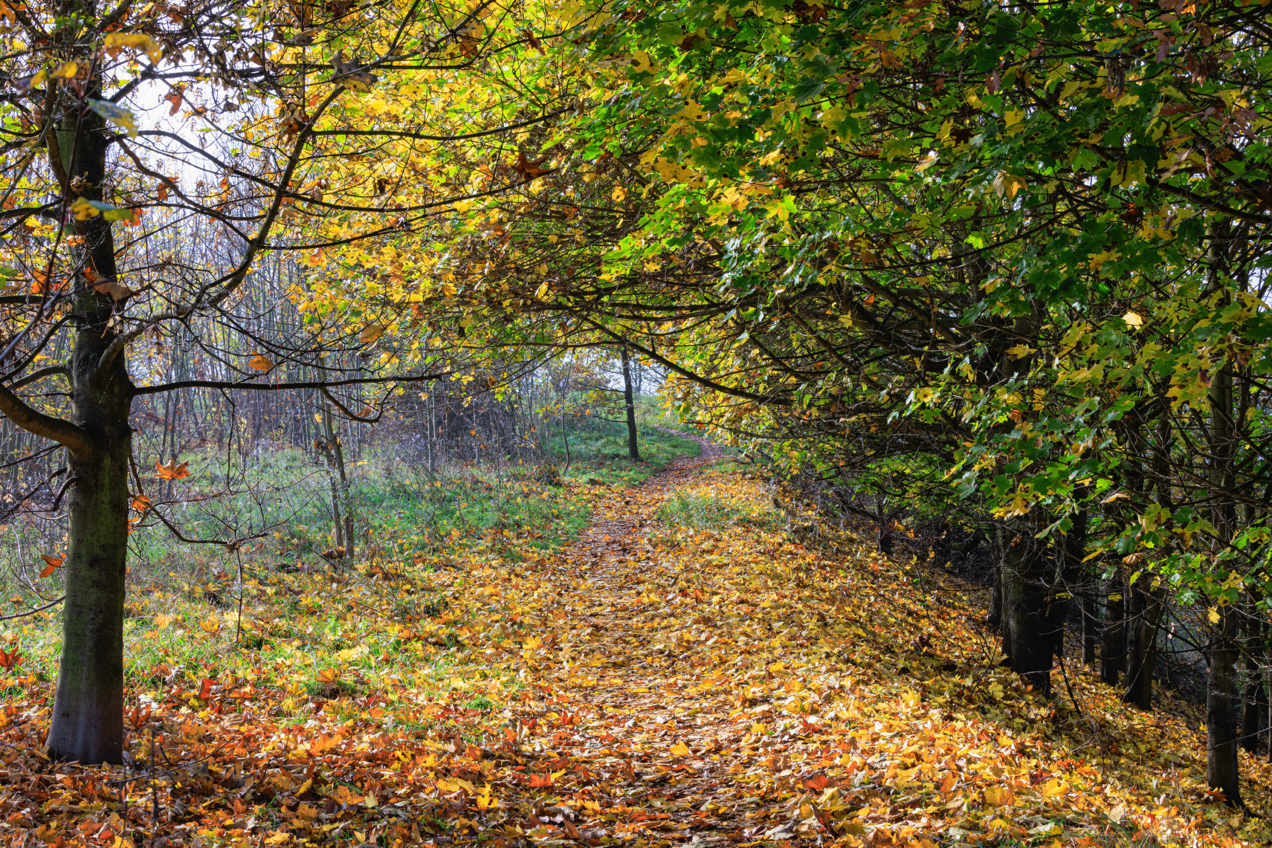 Snímek zachycuje jednu z pěšin, kterými se dá lokalita Hradiště projít. Po pravé straně fotografie jsou vzrostlé javory. Vlevo je řidší porost mladých stromů.